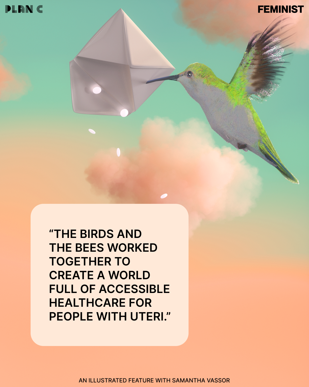 When working on this piece for PLAN C, I wanted to think of a world where abortion care was so accessible, hummingbirds carried envelopes and let abortion pills rain from the sky. The birds and the bees worked together to create a world full of accessible healthcare for people with uteri. The plant and animal life are reminiscent of Floridian and Caribbean landscapes and bring a sense of comfort: This is a world I long for.